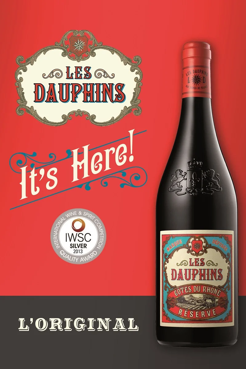 "O desafio inicial quando o consumidor está defronte a uma prateleira é de convencê-lo a pegar uma garrafa em detrimento da outra. Aí entra o design. A estética do Les Dauphins foi minuciosamente planejada. O desenho do rótulo ficou a cargo de Neil Tully, que lidera o bureau especializado, Amphora, e além de designer detém o cobiçado título de Master of Wine (a mais alta certificação no vinho). O profundo conhecimento de Neil sobre o assunto trouxe grande autenticidade ao projeto, ao incorporar a história da França e as tradições do Velho Mundo em uma identidade visual que se destaca em qualquer prateleira. A etiqueta do Les Dauphins reflete bem as inspirações francesas da década de 1920, com seus tons de vermelho e azul vibrantes, seus contornos em espiral e a fonte vintage. Ela parece que saiu de um poster de época, quando a "juventude perdida" ocupava os cafés de Paris e a arte e o amor dominavam a cena. Nas palavras de Nicole Talec, diretora da marca, "o estilo retrô foi concebido para atrair tanto os tradicionalistas em busca de um Rhone clássico quanto os consumidores aventureiros que buscam algo novo da França. Acreditamos que Les Dauphins é a marca de vinho mais emocionante que a França produziu nas últimas décadas."