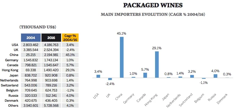 Três países respondem por mais da metade do comércio global. E quais são eles? França, Italia e Espanha. Entre os "hot countries" destaque para a Nova Zelândia - saltou de USD 223 milhões exportados em 2004 para USD 882 milhões em 2016;